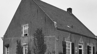 BOERDERIJ van het langstraatse type met dwarshuis, begin 19e eeuw. Zadeldak tussen puntgevels. Vensters met luiken, deuromlijsting met consoles, houten kroonlijst. Zes stoeppalen van hardsteen en kettingen. Rechts een grote grote schuur van gepotdekselde houten delen met rieten wolfdak.
