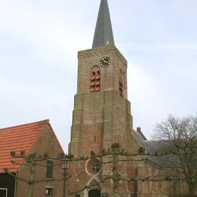 Ned.Herv.Kerk. Gotische kruiskerk, bestaande uit een eenbeukig 15e eeuws schip en zuiderdwarsarm omstreeks 1500. Verdwenen zijn het koor en de noorderdwarsarm (de laatste gesloopt in 1769). Inwendig houten gewelf, rustend op boogfries.