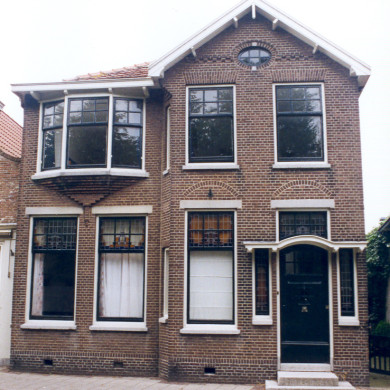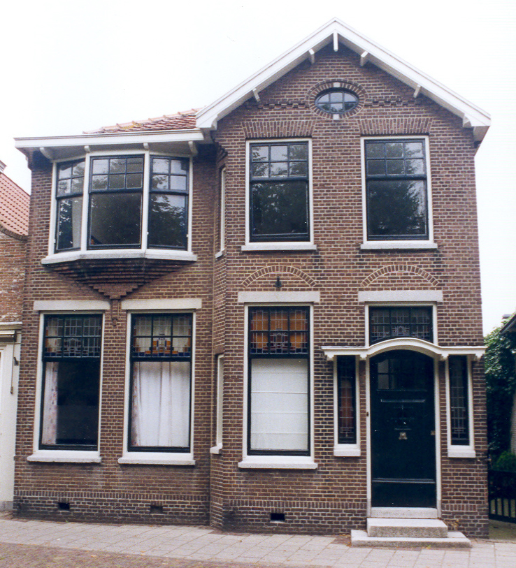 Woonhuis op rechthoekige plattegrond in drie bouwlagen waarvan één in de kap, gebouwd in 1916 in traditionele stijl met details van de Art Nouveau stijl.