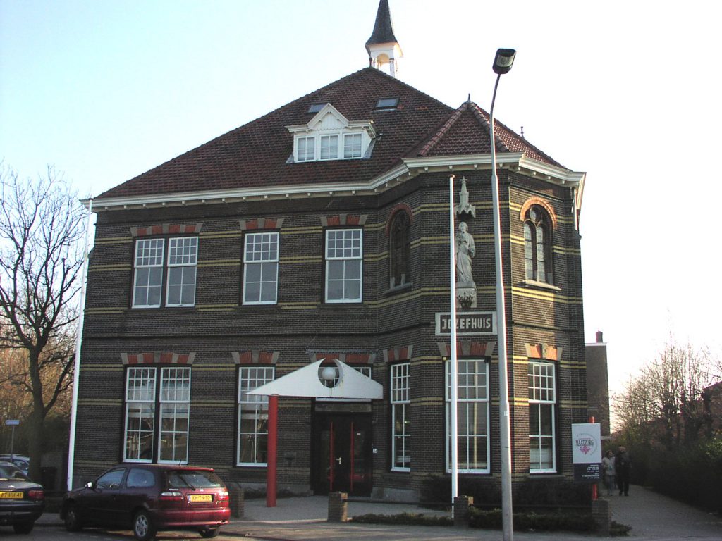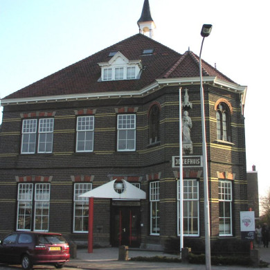 De voorgevel is voorzien van een hardstenen plint. De rechterzijde van de voorgevel is over de volle hoogte uitgebouwd met een driezijdige erker. In de voorgevel is ter hoogte van de verdieping een plaquette met de naam ingemetseld. Daarboven is een beeld van St. Jozef op een gebeeldhouwde console geplaatst onder een hardstenen baldakijn. De overige gevelvlakken van de erker bezitten op de verdieping een rondboog-vensteropening, waar binnen op een bakstenen montant een cirkelvormige tracering is geplaatst. Het venster bevat een glas-in-loodvulling. Direct links naast de erker is de entree gesitueerd in de vorm van dubbele secundaire deuren en een vast 18-ruits bovenlicht.