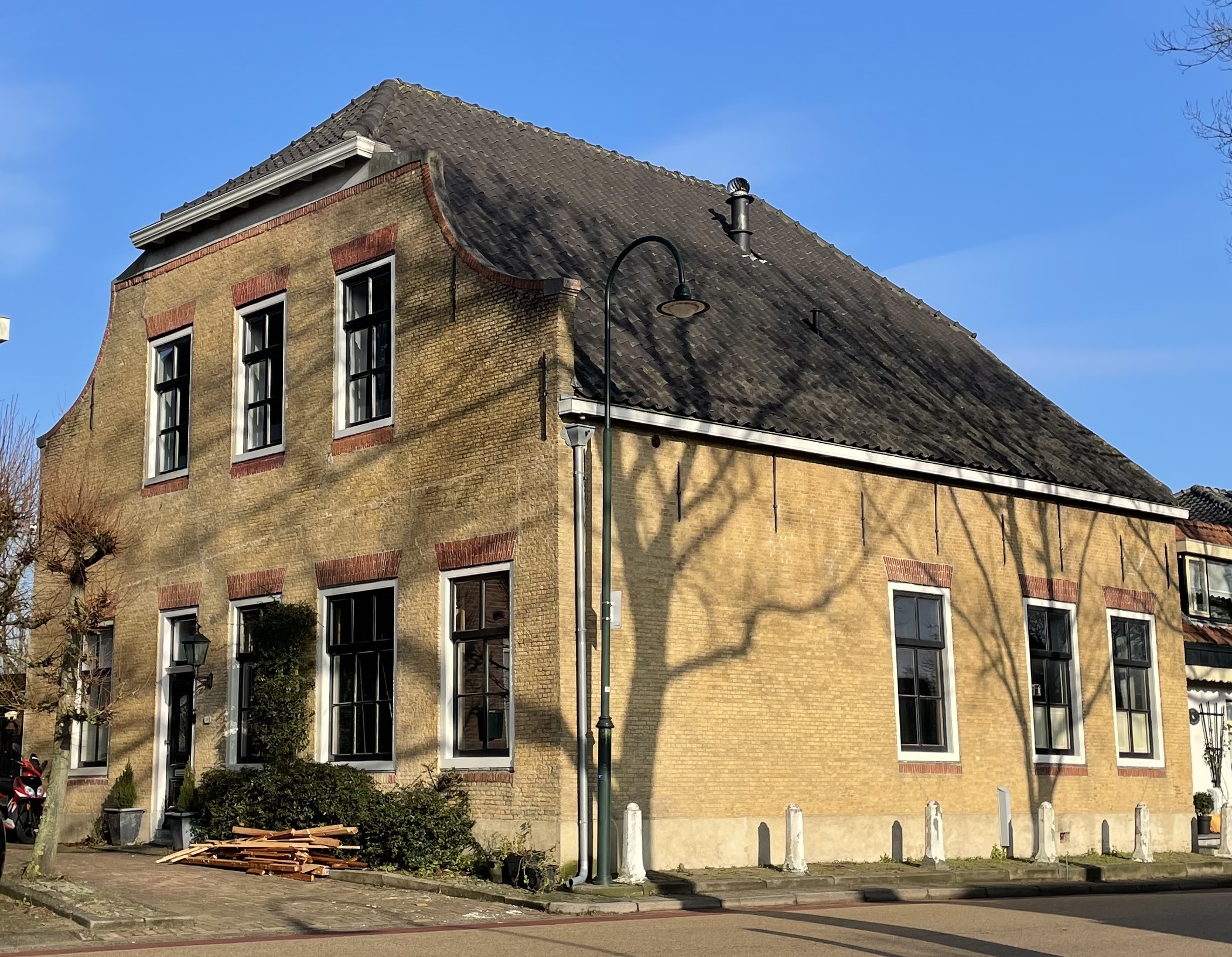 Voormalig RECHTHUIS. Gebouwd op rechthoekige plattegrond, begin 19e eeuw, met verdieping en schilddak. Breedte tien vensterassen. Gevelsteen in Lod.XV-omlijsting. Inwendig een trap en bovenkamer met schouw en stucplafond uit de bouwtijd alsmede geschilderd behang door A.