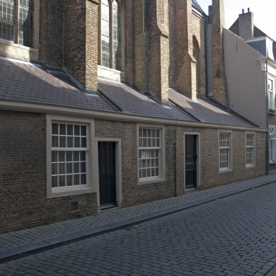 Tegen het koor der kerk gebouwd ondiep pand uit de 18e eeuw, met lijstgevel waarin ramen met kleine roedenverdeling. Naar het koor afdalend lessenaardak.