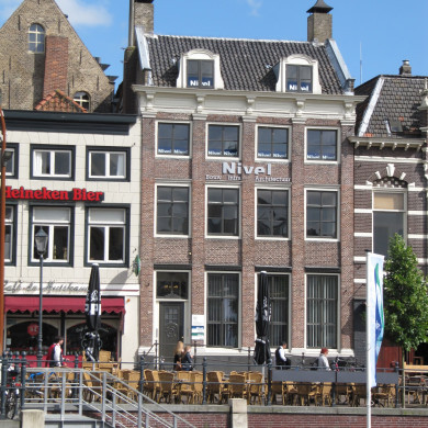 Hoekpand aan de voormalige Vismarkt, cafe "de Oude Zalm". Gebosseerd grijsgepleisterde lijstgevels.