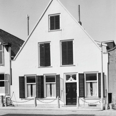Pand met gepleisterde puntgevel onder rollaag, 18e eeuw. Dubbele deur, begin 19e eeuw met geprofileerd kalf en fraaie levensboom in het bovenlicht. Vijf hardstenen stoeppalen met kettingen.