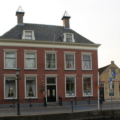 Herenhuis, eerste helft 19e eeuw, met dwars schilddak, waarop hoekschoorstenen. Boven de parterre een bakstenen lijst. De verdiepingen hebben vensters met geprofileerde,houten omlijstingen en schuiframen uit de bouwtijd. Dubbele deur met panelen. Houten kroonlijst met consoles.