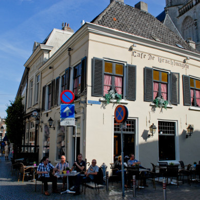 Huis aan de voet van de toren der Grote Kerk, cafe "De Vrachtwagen". Gepleisterde gevels en schilddak. 17e-19e eeuw. Vensterluiken