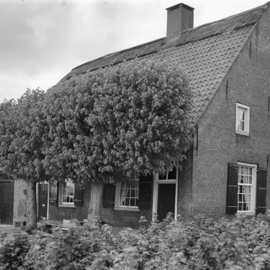 Boerderij van het Brabantse langgeveltype met schuur van het Vlaamse type waarop rieten dak met pannenvoet. 1875. (Vlaamse schuur is in 2007 afgebrand)