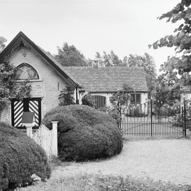 BOERDERIJ in neogotische stijl, 19e-eeuws langhuis, gesneden dakrand versieringen.
