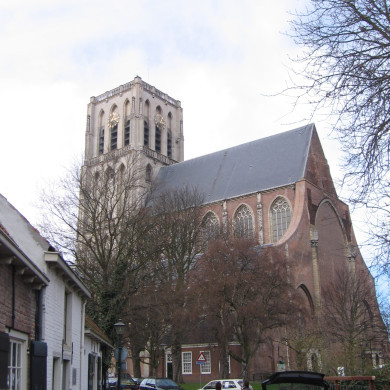 Grote of St. Catharijnekerk. (Ned.Herv.). In aanleg groots opgezette kruisbasiliek, waarvan alleen het driebeukige, van kapellenrijen tegen de zijbeuken voorziene schip en de ingebouwde toren, begonnen in 1462, voltooid werden. Indrukwekkend staal van de Brabantse late gothiek met zuilen met krulkoolkapitelen, zijbeuken met kruisribgewelven. Van de stenen overwelving van het middenschip zijn slechts de aanzetten voltooid. Inkassingen voor de luchtbogen tegen de lichtbeuk. Fraaie kapiteelsculptuur. Preekstoel 1778, herenbanken, graftombe voor admiraal Philips van Almonde (1711). Een orgel met Hoofdwerk en Bovenwerk, in 1854 gemaakt door W.H. Kam. In 1989 door Pels en Van Leeuwen gerestaureerd en uitgebreid met een vrij Pedaal. Kerk en toren gerestaureerd 1894-1929 en 1950-1951. Klokkenstoel met gelui bestaande uit een klok van S. Butendiic, 1482, diam. 188 cm en een klok van Cypr. Crans, 1744, diam. 110 cm en een klok van P. Bakker, 1773, diam. 83 cm. Klokkenspel, bestaande uit 23 klokken van François Hemony, 1660 en 24 moderne klokken. Smeedijzeren trommelspeelwerk, gemaakt door Jan van Wassenburgh, 1578, buiten gebruik gesteld.