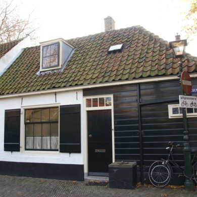 Bouwvallig doch schilderachtig dwarshuisje van alleen begane grond onder hoog zadeldak. Belangrijk voor de situatie van de St. Catharijnekerk. Gewitte gevel.