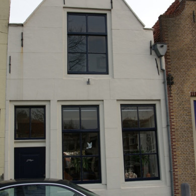 Hoge tuitgevel (XVIII) met rollaag voor huis van parterre, verdieping en zolderverdieping. Zoldervenster met roeden in stijl XVIII. Sierankers. Stoep met stoeppalen.
