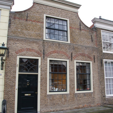 Brede lijstgevel (ca. 1800) voor huis van parterre en verdieping. Empire-ramen in de verdieping. Deuromlijsting met verdiepte pilasters en acanthus ornament, stijl Lod. XIV. Stoep met stoeppalen.