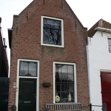 Huis met geverfde tuitgevel. XIXa. Stoep met stoeppaal.