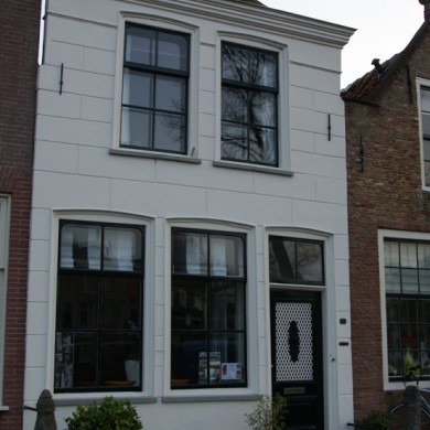 Huis met puntgevel (XVIII) met in het zoldervenster roedenverdeling in stijl XVIII. Stoep.