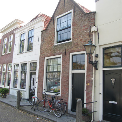 Huis met puntgevel (XVIII) met in het zoldervenster roedenverdeling in stijl XVIII. Stoep.