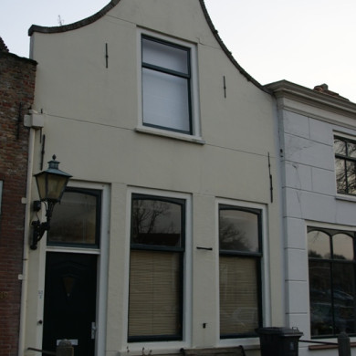 Huis met puntgevel (XVIII) met in het zoldervenster roedenverdeling in stijl XVIII. Stoep.