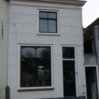 Huis met puntgevel (XVIII) met in het zoldervenster roedenverdeling in stijl XVIII. Stoep.