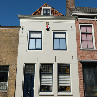 Eenvoudige, gepleisterde lijstgevel XIX A voor huis (XVII ?). In de gevel een gebeeldhouwde, schildhoudende leeuw. Fraaie muurankers. Schilddak.