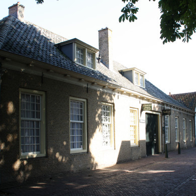 Naast de Zuidelijke gevel van het Torpedomagazijn lage huisjes om binnenplaats onder schilddaken. Roedenverdeling uit de bouwtijd.