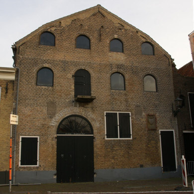 Groot pakhuis met gewijzigde puntgevel en getoogde vensters. Gevelsteen met bekroond hart en: 1620.