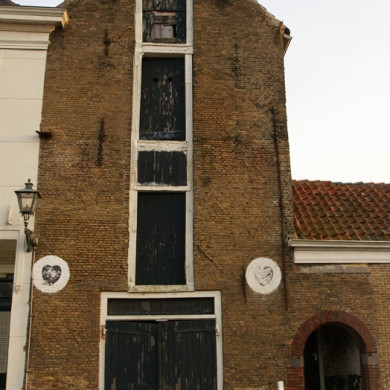 Groot pakhuis met gewijzigde puntgevel en getoogde vensters. Gevelsteen met bekroond hart en: 1620.