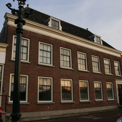 Statig patriciërshuis circa 1800 van parterre en verdieping met hoog schilddak, waarin twee dakvensters met vleugelstukken. Lijstgevel van zeven vensterassen met hardstenen vensterdorpels en roedenverdeling uit de bouwtijd stijl achttiende eeuw. Rijk gesneden deur met omlijsting Lodewijk XVI. Rechts erkervormige uitbouw met schilddak. Stoeppaal met hek.