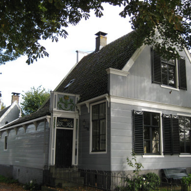 Houten huis in L-vorm, XVII-XVIII. Aan de straat en opzij puntgevels. De puntgevel opzij bezit nog een goed kruiskozijn. De voorgevel met fronton. In een kamer schoorsteenmantel in Lodewijk XVI stijl en twee bedsteden in Lodewijk XVI-stijl.