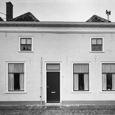 Dubbeldakig pand met brede door middel van een lijst afgeknotte geverfde lijstgevel, XVIIIc-XIXa.