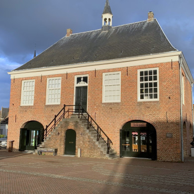 Aan de Markt gelegen voormalig schepenhuis uit 1616, gerestaureerd in 1771, 1860 en 1982. In kruisverband gemetseld bakstenen voormalig bestuurs- en rechtspraakgebouw op rechthoekige plattegrond, twee bouwlagen hoog en onder een met leien gedekt schilddak. Midden op de nok een klokkentorentje met spitsje en op de uiteinden gemetselde schoorstenen. Aan de zijde van de Markt leidt een naar voren springende, gemetselde dubbele trap van en naar de verdieping met centraal geplaatste ingang.