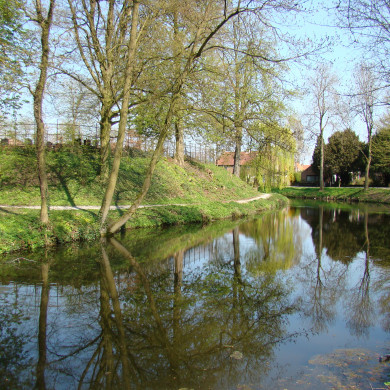 Emplacement van het voormalig kasteel, waarvan de aarden omwalling nog grotendeels intact is en waarop zich een gedenkteken bevindt, samengesteld uit belangwekkende fragmenten renaissance-sculptuur.