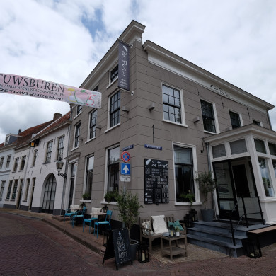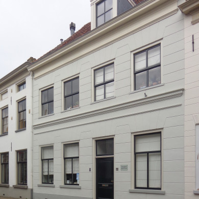 17e eeuws pand met verdieping, lage zolderverdieping en hoog zadeldak, evenwijdig aan de straat met links een puntgevel, die waarschijnlijk oorspronkelijk trappen heeft bezeten. De voorgevel met kroonlijst is gepleisterd en heeft een 19e eeuws karakter.