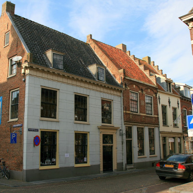 17e eeuws pand met verdieping en hoog zadeldak, evenwijdig aan de straat, tussen trapgevels. Gepleisterde gevel met rijke sierankers; goede, driedelige winkelpui uit het derde kwart der 19e eeuw; hijsluik met gemetselde zijwanden. De moerbalken hebben gesneden sleutelstukken met steekbandversiering.