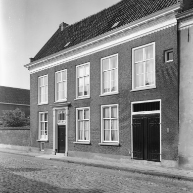 In oorsprong laat-middeleeuws pand met verdieping en zadeldak, evenwijdig aan de straat, tussen puntgevels met vlechtingen. Achtervleugel, evenwijdig aan de voorste vleugel. Lijstgevel uit het midden der 19e eeuw, ter breedte van vijf vensterassen. Deur uit de bouwtijd van de gevel in pilasteromlijsting met bovenlicht en hoofdgestel. Rechts inrijdeuren. Vensters met zesruitsschuiframen. Inwendig een kamer met laat 18e eeuwse muurschilderingen, die achter behang verborgen zijn.