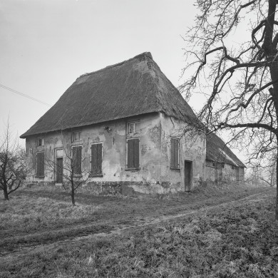Gepleisterde boerderij op T-vormige plattegrond, 17e eeuw. Het woonhuis heeft een hoog rieten schilddak, de dwars daarachter gebouwde stal heeft een rieten dak met overstek aan de achterzijde.