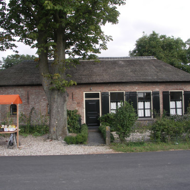 Gepleisterde boerderij, eerste helft 19e eeuw van begane-grond met rieten schilddak. Vensters met luiken en zesruitsramen. Links de stal met getoogde vensters.