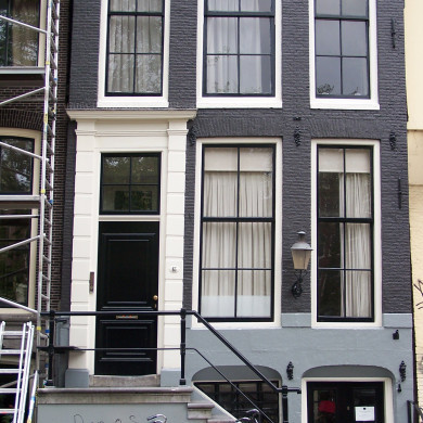 Pand met gevel (XVIII) met stucversiering (XIX B) en deuromlijsting (XVIII).