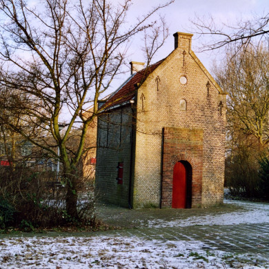 Gevangenis van het v.m.Slot. Een blijkens het steenformaat in de 16e eeuw gebouwd rechthoekig bouwwerk onder een zadeldak tussen met rollagen afgedekte puntgevels.