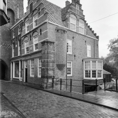 Pand met verdieping uit omstreeks 1600 op rechthoekige plattegrond. Zadeldak, dat aan de voor- en achterzijde wordt afgesloten door trapgevels, terwijl zich boven de vrijliggende zuidgevel eveneens een trapgevel bevindt. Tegen de zuid-westhoek van het pand, dat in 1959 gerestaureerd werd, een bakstenen pijler, in natuursteen gebosseerd en afgedekt met een hoofdgestel, overblijfsel van de v.m. voorpoort van de Lanxmeerpoort. Hiernaast een cilindervormige, uitgekraagd bakstenen traptorentje, eveneens van de voorpoort afkomstig. De drie trapgevels van het pand vertonen het Zuidhollandse type met waterlijsten, ontlastingsbogen met metselwerkmozaiek en sierankers. De voor- en zijtopgevel doorregen met natuurstenen banden. Onder de benedenste waterlijst van de voorgevel een getande puibalk. De onderpui is gereconstrueerd in vormen omstreeks 1800 bij de restauratie. Tegen de zijgevel een uitgekraagde erker op korbelen (XVIII) en een zestal peilstenen.