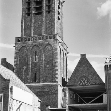 Toren van de Ned. Herv. kerk. Half ingebouwd, bakstenen bouwwerk, waarvan de onderste twee geledingen - de benedenste onversierd, de volgende met drie spitsboognissen in ieder gevelvak - waarschijnlijk uit het eerste kwart 14e eeuw dagtekenen en worden afgesloten door een merkwaardige bakstenen spitsboogbalustrade. De rijzige klokkenverdieping, sinds de brand van 1654 zonder spits, is in de 15e eeuw toegevoegd en vertoont met haar drie geprofileerde spitsboognissen in ieder gevelvlak een Nederrijns-gotisch karakter. In de toren, die over de benedenverdieping een ribloos kruisgewelf op kraagstenen heeft, een klokkenstoel met modern klokkenspel, bestaande uit zes klokken uit het oude gelui van F. en P. Hemony, 1654/1655, en 41 moderne klokken.