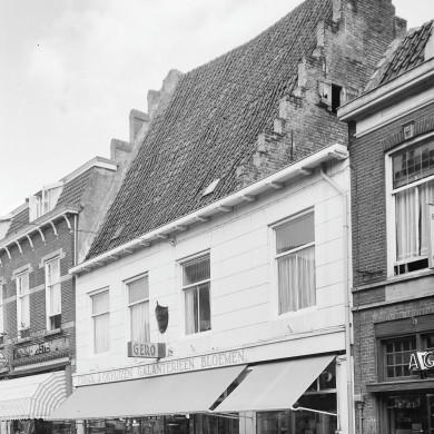 Hoekpand Slotstraat. Laat 16e eeuws pand met verdieping en schilddak. De zijgevel langs de Slotstraat bezit een op gesneden consoles uitgekraagde verdieping met puibalk, die versierd is met knorrenornament (omstreeks 1600). De gevels hebben verder een 19e eeuws uiterlijk.