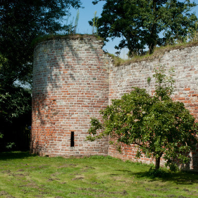 Restant van de 14e eeuwse ommuring, westelijk van de Lanxmeersepoort tot de zuidwesthoek der oude stad en vandaar, ongeveer evenwijdig aan de Herenstraat een muurgedeelte, waarin de zuidwesthoek het onderste gedeelte van de Schutterstoren, een ronde hoektoren, van belang uit oogpunt van krijgshis