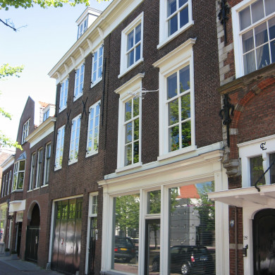 Pand met monumentale trapgevel (XVIIA) met geprofileerde natuurstenen waterlijsten, geblokte ontlastingsbogen en muurankers. Boven de bij de restauratie in oude stijl vernieuwde pui twee brede geprofileerde ontlastingsbogen op consoles.