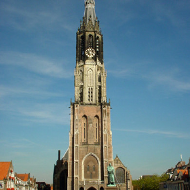 Sobere, laat-gotische kruisbasiliek (dwarspand XIVd, toren 1396 - 1496, schip XVb, koor XVc door Jacob van der Borch. Hersteld na stadsbrand van 1536. Restauraties: torenspits, ijzerconstructie door Gugel naar ontwerp P. Cuypers, koor 1923-'25, schip 1931-'37, toren 1939-'50. Alleen de kooromgang heeft stenen gewelven; verder houten tongewelven met trekbalken. Alleen het koor inwendig van grotere verfijning, o.a. vensterbanktriforium. Orgel met Hoofdwerk, Bovenwerk, Rugwerk en vrij Pedaal, in 1840 gemaakt door fa Batz en Comp. Inventaris: In het hoogkoor boven de grafkelder der Oranjes het rijke praalgraf voor Willem van Oranje door H. de Keyser (1614-'23. In de kooromgang grafmonumenten door Canova en W. Geefs, alsmede twee epitafen (XVII) en een monument voor Hugo de Groot (1781). Grafzerken. In het koor 16 gebrandschilderde ramen (W.A. van Konijnenburg, Joep Nicolas e.a., aangebracht tussen 1927 en 1936). Klokkenspel, bestaande uit 18 klokken van François Hemony, 1659/60 en 30 moderne klokken. Gelui bestaande o.a. uit een klok van François Hemony, 1662, diam. 104 cm. Torenuurwerk met speeltrommel van François Hemony, vervaardigd door Coenraad Harmensz. Broekman, Delft, in cartouche: 1570 van een ouder uurwerk en omgebouwd in 1664 door Jan van Call. In toren stellage met buiten gebruik gestelde klokken, 13 klokken uit 1659 van François Hemony, 3 uit 1678 van Pieter Hemony, 3 uit 1750/1751 van Joris de Mery en 1 van Gillett and Johnston uit 1929.
