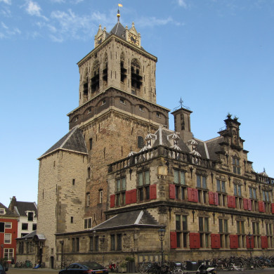 Stadhuis. Het aan de westzijde van de Markt tegenover de Nieuwe Kerk gelegen stadhuis heeft als kern een zware, met Gobertangersteen beklede toren uit ca. 1300, waarvan de klokkengeleding drie getraceerde nissen in ieder gevelvlak heeft en een spitsboogfries onder de daklijst. Korte spits met decoratieve wijzerplaten (1536). De toren wordt aan drie zijden omgeven door het van 1619-'20 door Hendrick de Keyser gebouwde raadhuis, bekleed met natuursteen en tegen de voorgevel versierd met ordonnanties van gebosseerde Dorische en gecanneleerde Jonische pilasters. De verdiepingsvensters hebben schelpvormige bekroningen en rond de dakvoet loopt een balustrade. De middenas, waarin de ingang, heeft een gebogen fronton met opzetstuk, waaronder drie nissen, in de middelste waarvan een Justitiabeeld. De zijvleugels hebben eenvoudiger gevels, elk bekroond door een opzetstuk met trapgevel. De ingangspartij is gewijzigd in 1850. Een restauratie is aangevangen in 1963. Inwendig bevat de toren onderling een oude stadsgevangenis. Luiklokken van Hendr. van Trier en Francois Hemony.
