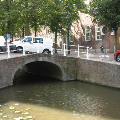 Over het water van de Oude Delft bij de Oude Kerkstraat. Vernieuwd in 1924. Boogbrug met balusterhekken.