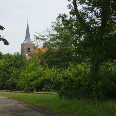 Herv. Kerk. Eenbeukig rechtgesloten kerkje in welks westzijde de westbouwachtige vroeg 13e eeuwse toren is opgenomen, aan de westzijde en ook overigens tot hoogte van de kerkmuren beklampt bij algehele wijziging van de kerk in 1778-'80. In de noordmuur de meeste restanten van de 13e eeuwse kerk. 18e eeuwse preekstoel. Klokkenstoel met klok van N. Sickmans, 1634, diam. 107 cm.