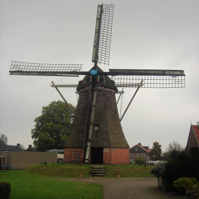 Windkorenmolen "De Nieuwe Molen". Achthoekige bovenkruier op bakstenen voet, waarvan de romp gedekt is met eiken schalien. In verwaarloosde toestand.