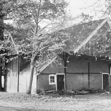 Twee fraai op het erf gesitueerde, forse vakwerkschuren, een met twee dwarsdoorritten, de ander met inrijdeuren in de smalle gevel.