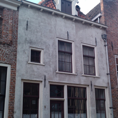 PAND met gepleisterde tuitgevel; hoog voorhuis. XVII/XVIII.