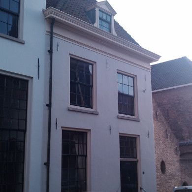 Onderkelderd pand met gepleisterde lijstgevel, dakkapel XVIII/XIX.